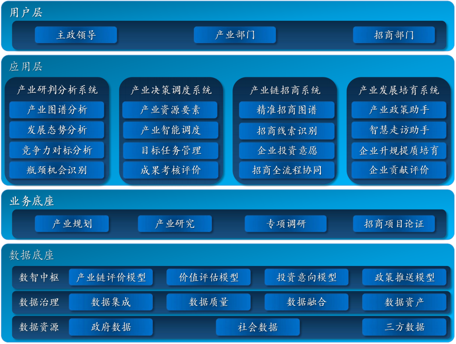 精準(zhǔn)招引、體系評(píng)估、統(tǒng)籌流程。從產(chǎn)業(yè)鏈視角出發(fā)結(jié)合產(chǎn)業(yè)模型,以補(bǔ)鏈和延鏈為核心,通過(guò)強(qiáng)大的數(shù)據(jù)處理能力與業(yè)務(wù)研究能力,對(duì)全國(guó)范圍內(nèi)的企業(yè)、項(xiàng)目、人才進(jìn)行識(shí)別與評(píng)估,為招商部門(mén)明確招引產(chǎn)業(yè)環(huán)節(jié),招引企業(yè)清單。幫助招商部門(mén)確定招什么產(chǎn)業(yè)環(huán)節(jié)、招那些企業(yè)、怎么招的問(wèn)題,并打通招前、招中、招后環(huán)節(jié),全面深入賦能產(chǎn)業(yè)招商工作。