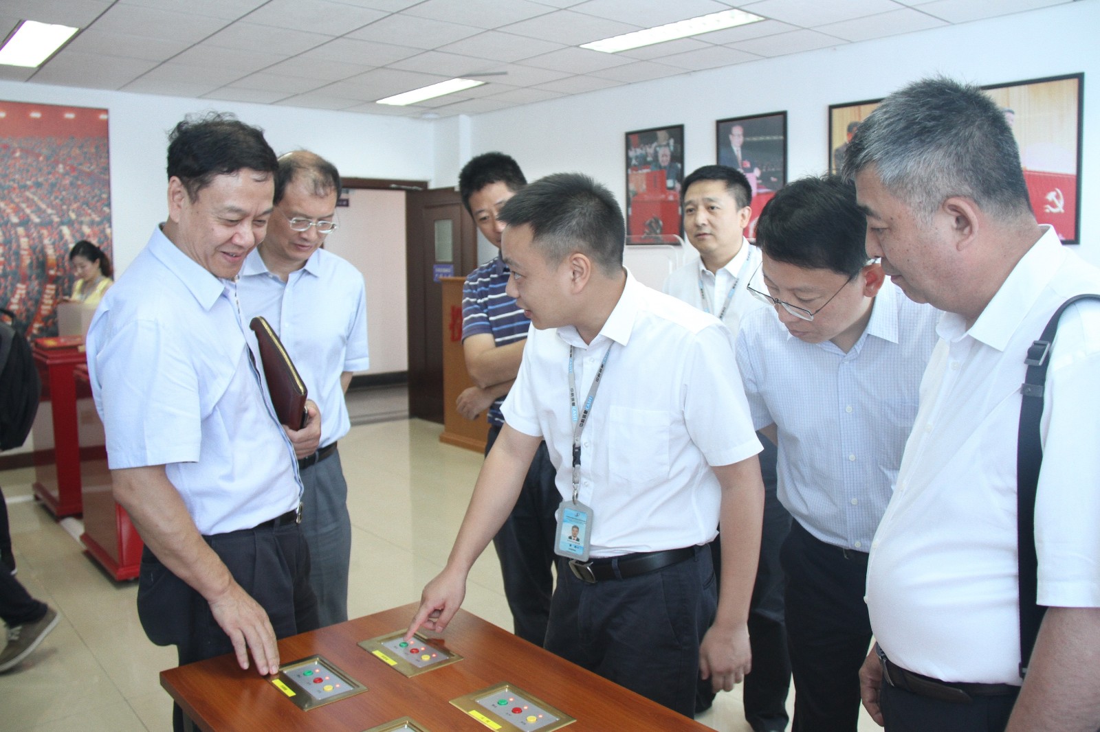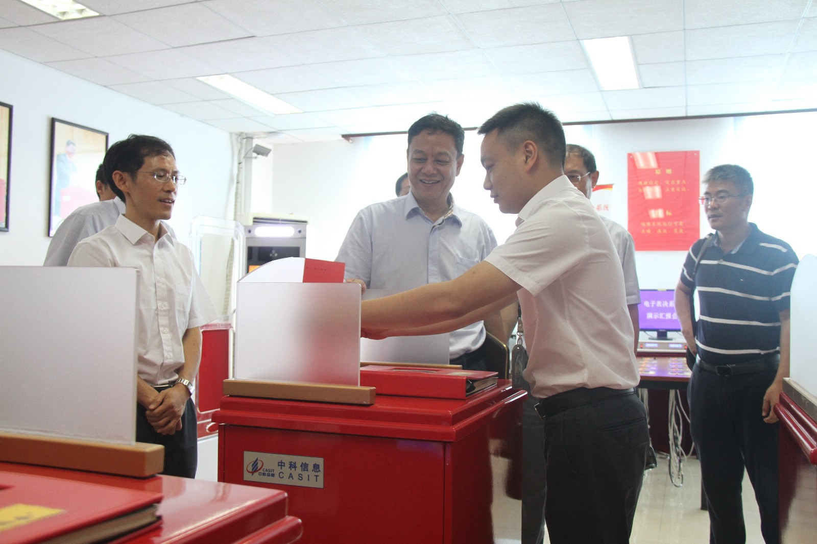 在中科信息數(shù)字會(huì)議系統(tǒng)展廳,鄧勇副秘書(shū)長(zhǎng)參觀(guān)了為歷屆黨代會(huì)和全國(guó)“兩會(huì)”會(huì)議選舉服務(wù)的電子票箱、人民大會(huì)堂使用的電子表決器、面向國(guó)內(nèi)基層選舉市場(chǎng)研發(fā)的新產(chǎn)品—計(jì)票通設(shè)備和海外電子選舉系統(tǒng)設(shè)備,并了解了中科信息數(shù)字會(huì)議系統(tǒng)研發(fā)歷程,以及新型電子選舉系統(tǒng)和電子表決系統(tǒng)在黨的“十九大”和十三屆全國(guó)“兩會(huì)”上的使用情況。