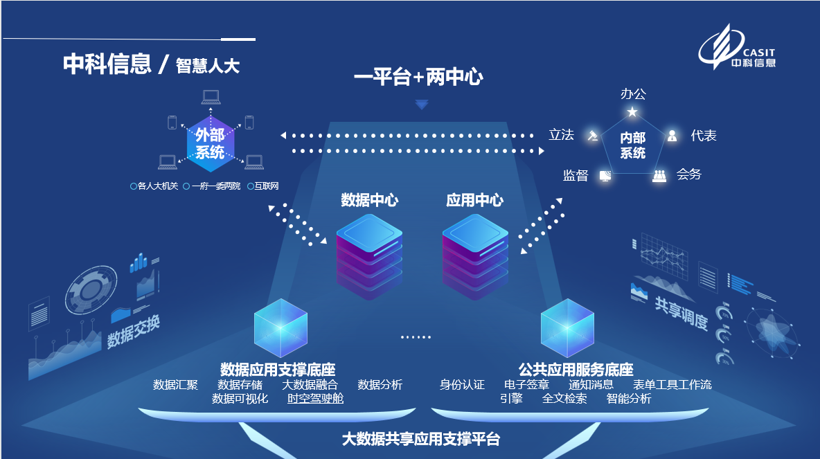 中科信息“智慧人大”是以自主創(chuàng)新、安全可靠為核心,以基礎(chǔ)設(shè)施為支撐,以標(biāo)準(zhǔn)為重點(diǎn),結(jié)合“互聯(lián)網(wǎng)+”、大數(shù)據(jù)、人工智能技術(shù)開(kāi)發(fā)的智規(guī)范和管理機(jī)制為保障,以服務(wù)“三會(huì)”和人大代表為中心,以提高機(jī)關(guān)工作水平能業(yè)務(wù)平臺(tái)。